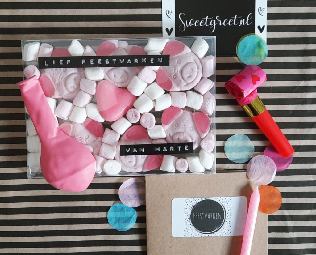Lief feestvarken, van harte – Snoepvarkens, snoephartje, mini marshmallows, ballon, verjaardagstoeter & verjaardagskaarsje (willekeurige kleur) – Euro 6,95 (excl. verzendkosten)