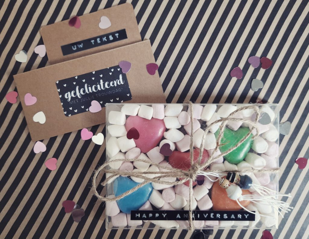 Happy anniversary – Trouwdag – Snoephartjes, mini marshmallows, gelukspoppetjes bruidspaar – Euro 6,95 (excl. verzendkosten)